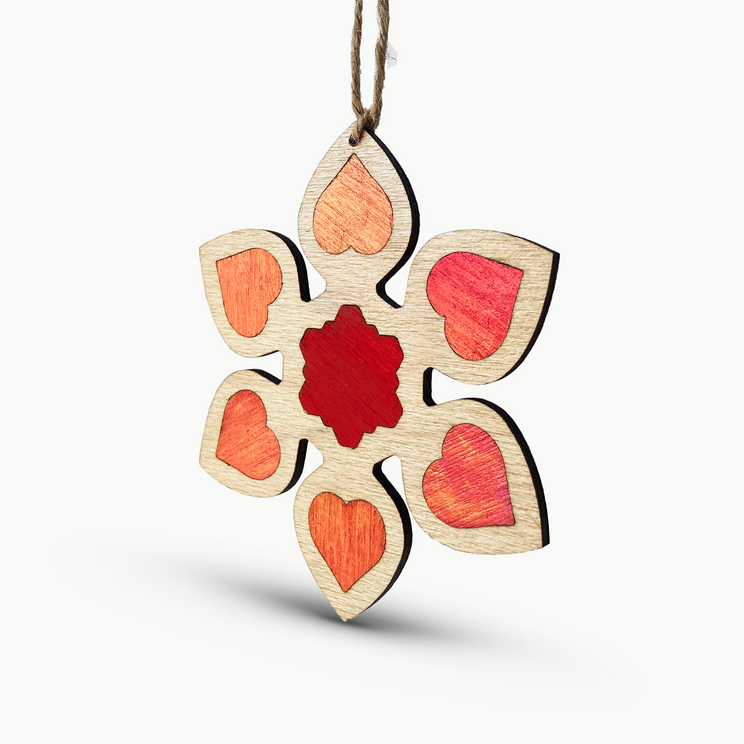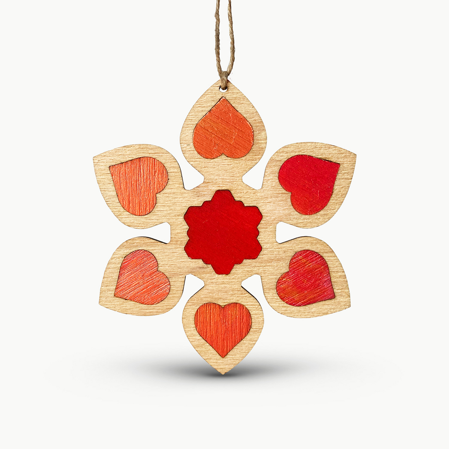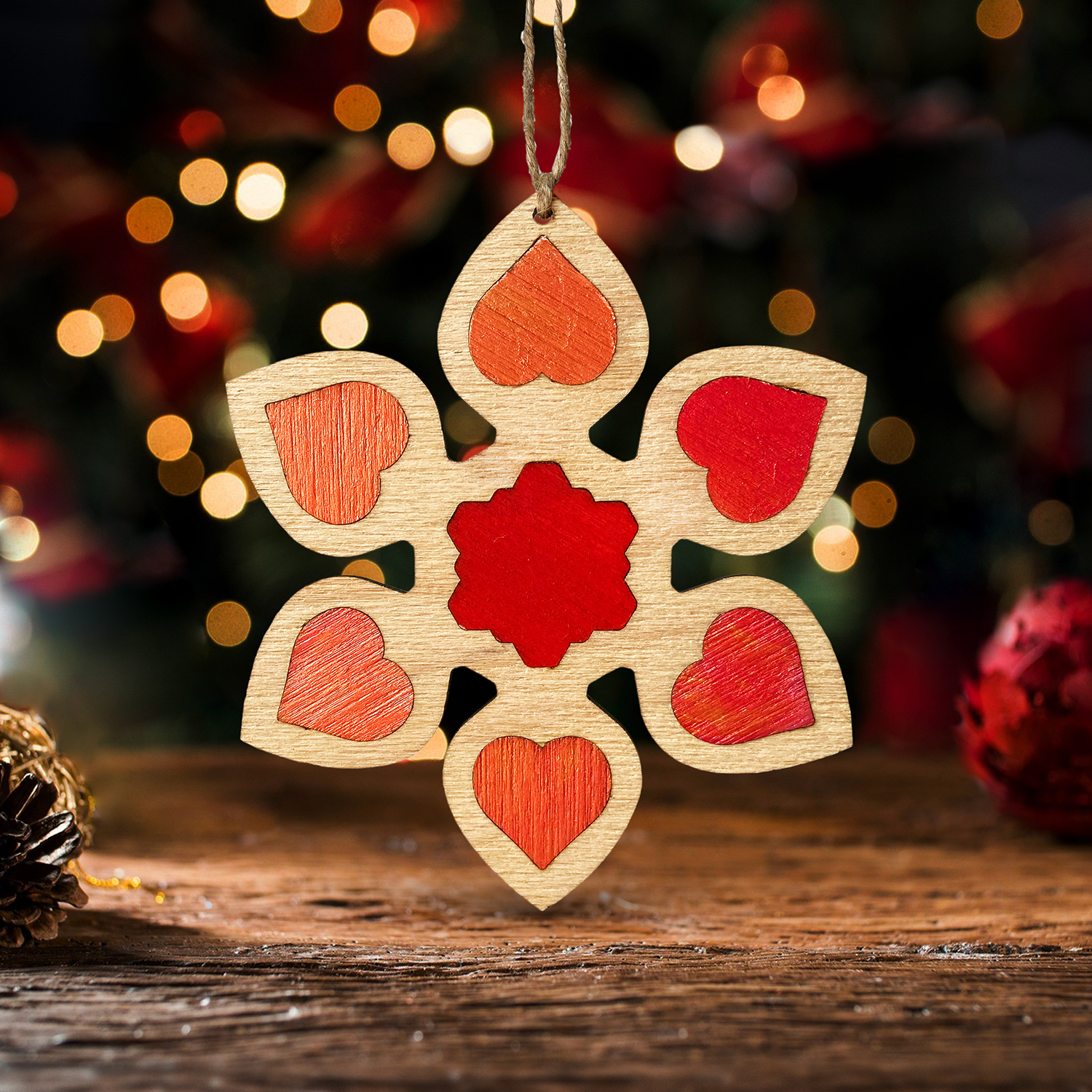 Decorațiune pentru Pomul de Crăciun – Intarsie lucrată în atelierul RedOwlCraft® în lemn de fag cu inserții din lemn de fag pictate manual în acrilic și tratate cu varnish.