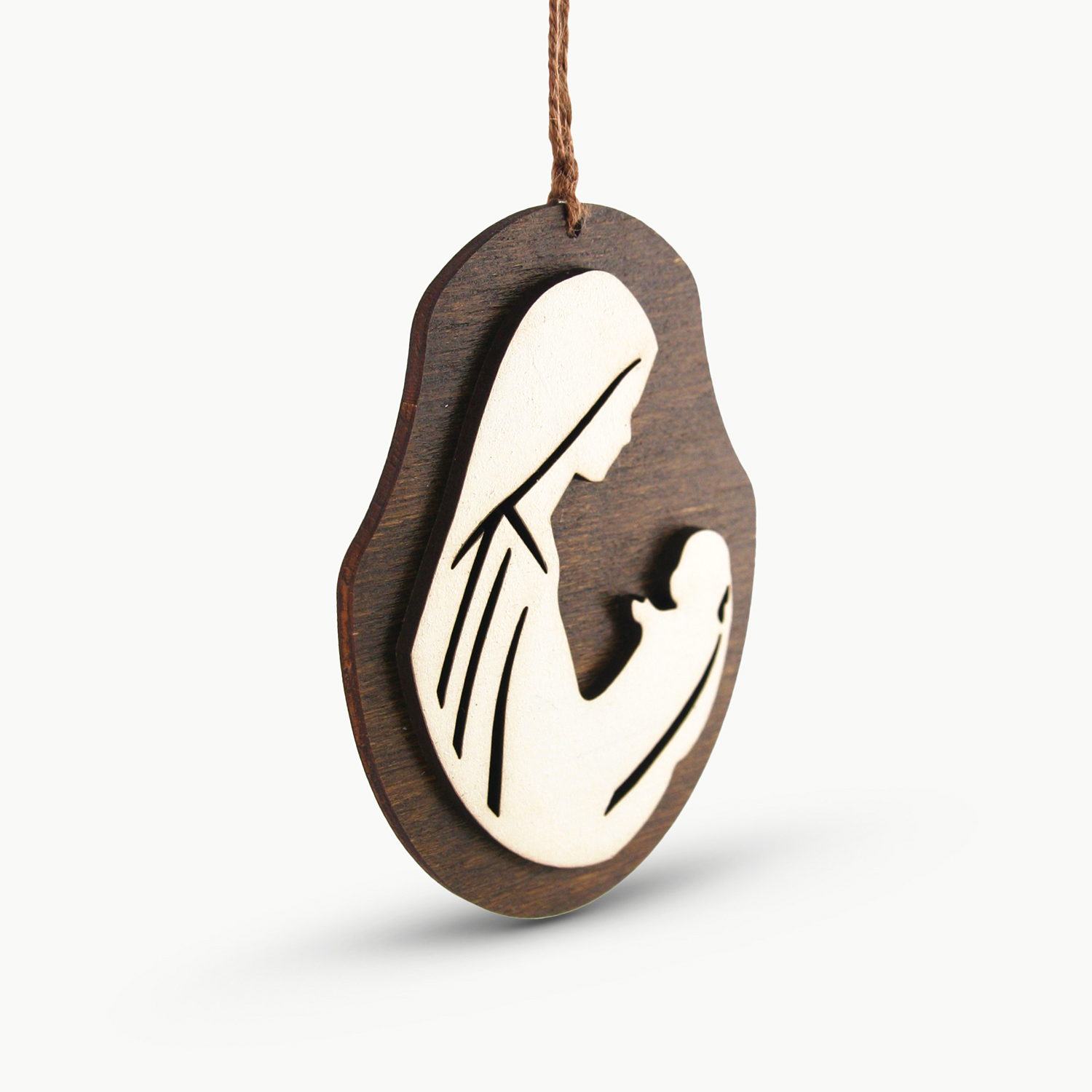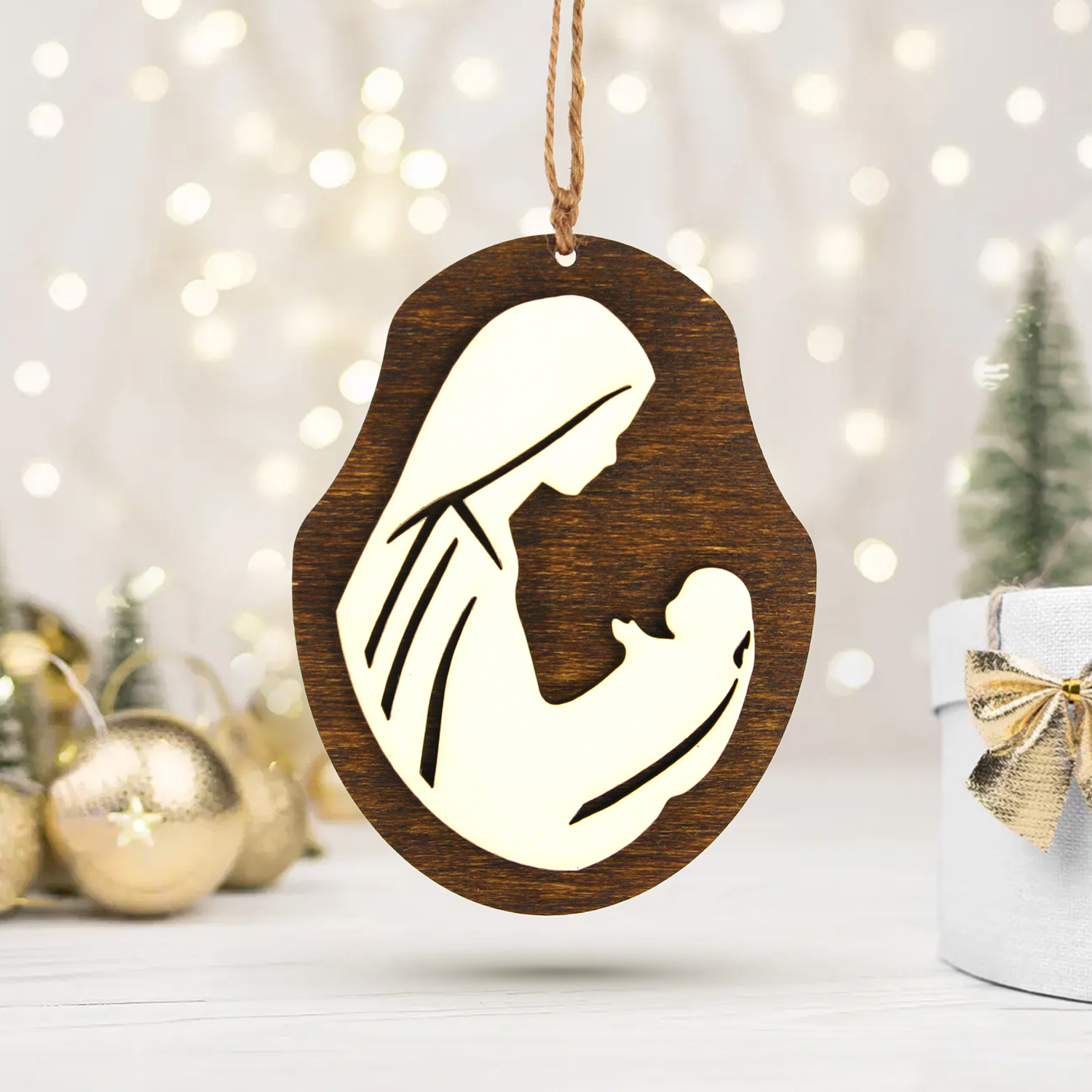 Decorațiune pentru Pomul de Crăciun – Motiv Fecioara cu Pruncul lucrată în atelierul RedOwlCraft® în lemn de fag și HDF vopsit manual în acrilic.